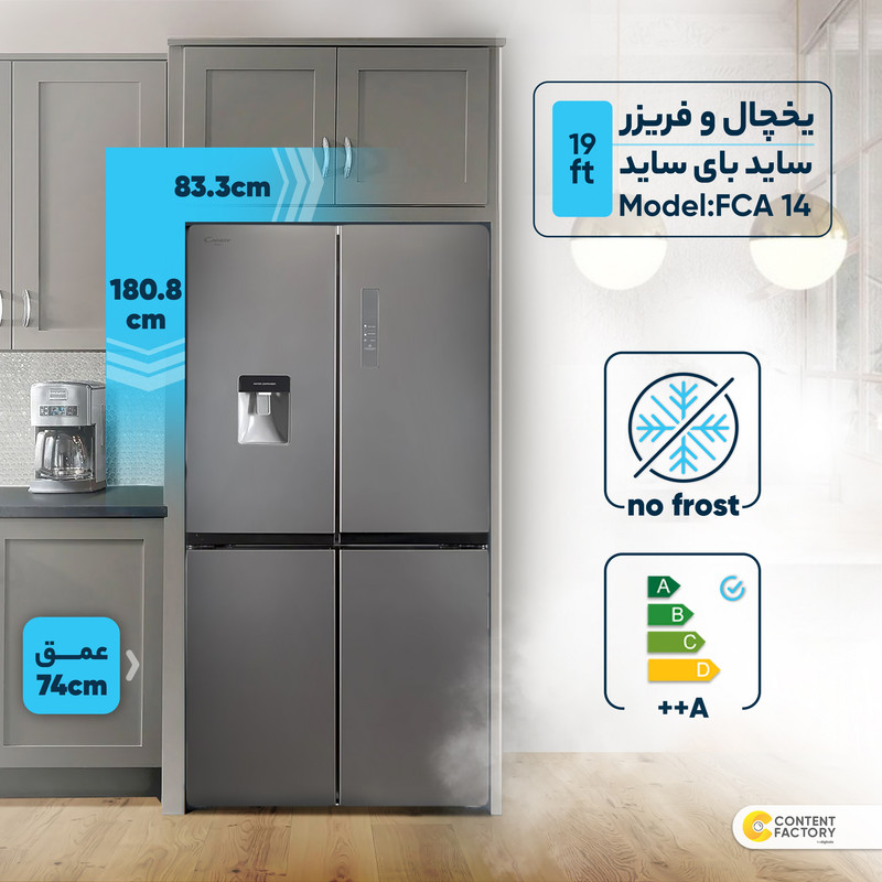 یخچال و فریزر ساید بای ساید 19 فوت کندی مدل FCA 14 با رویکردی همه جانبه گزینهای مناسب برای خانوادههایی با جمعیت متوسط است. طراحی ساده اما زیبا با چهار درب جدا، مصرف انرژی را در این محصول به حداقل میرساند. ظرفیت کلی 479 لیتر با طراحی سه طبقه، پنج طبقه روی درب و دو کشو در بخش یخچال به همراه شش کشوی فریزر در دسترس کاربران قرار میگیرد. نمایشگر با کنترل لمسی در کنار دستگیرههای افقی مخفی با وسعت عملکردی خوب از جذابیتهای بخش طراحی این ساید بای ساید کندی است. جذابیتهای ساختاری این محصول شامل آبسردکن و یخساز نیمه اتوماتیک با مخزن آب و امکان سرمایش و انجماد سریع است. البته نباید محفظه مخصوص جهت تازه نگه داشتن مواد غذایی، سیستم جریان هوای چندگانه به منظور بهبود کیفیت مواد غذایی و سیستم بدون برفک را نادیده گرفت.